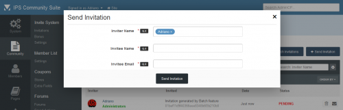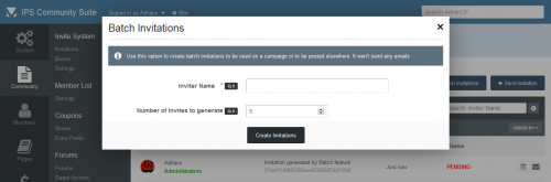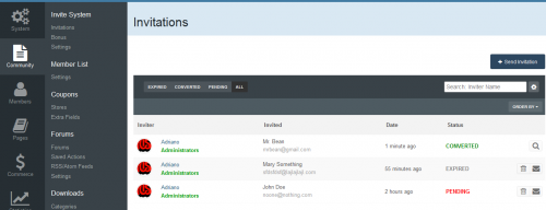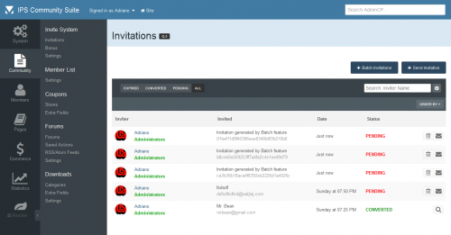 - Invitations Management: a place where you can see the status of each invitation. The status are: PENDING, CONVERTED and EXPIRED. You can invite people, delete or resend invitations. You can also create batch invitations, to be used on a campaign or to be posted elsewhere. It won't send any emails.