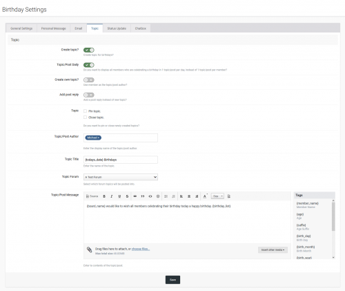 - Create new birthday topics or add replies to a "birthday topic" when there is a members birthday.