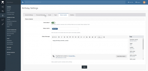 Birthday greeter that can send out birthday emails, topics, personal messages, status updates and chatbox messages to members celebrating their birthday. Included widgets to also wish members a happy birthday.