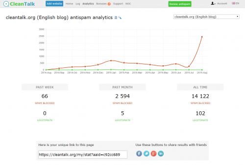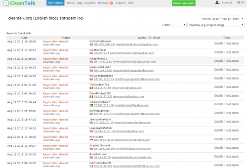 Service CleanTalk (this hook is a client application for CleanTalk anti-spam service) records all filtered comments, registration and other spam attacks in the "Log of spam attacks" and stores the data in the log up to 45 days. Using the log, you can ensure reliable protection of your website from spam and no false/positive filtering.