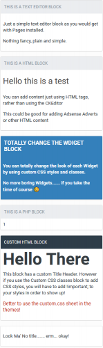 - You can easily add CCS styles to the Block Title and Content using the Widget Forms rather than having to edit templates. This makes it easier to customise each block differently to have a different look and feel to match your website theme.