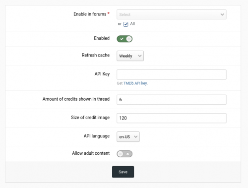 - After installation a free TMDb API key has to be added in the settings. The API key can be obtained here.