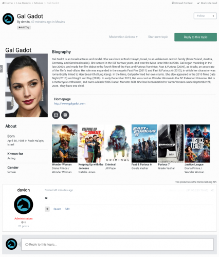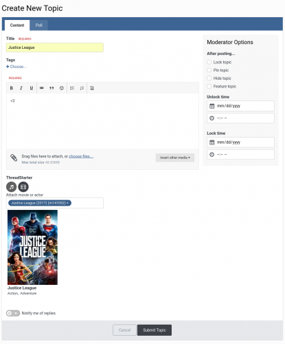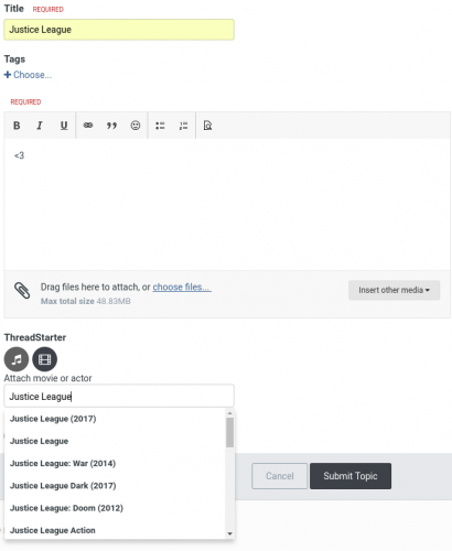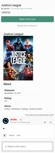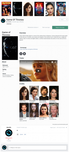 - Users can add movies, series, anime and actors to topics. After attaching the content, which can be done easily using a search with auto complete, the thread will show various information about the chosen content above the post.