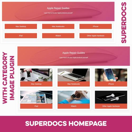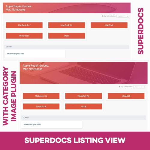 - Pages SuperDocs is compatible with the Pages Category Images plugin. Upload images for your database categories with it and Pages SuperDocs will make your database look even more appealing (See screenshots for a comparison). Without this plugin, you will only be able to change the header image of the SuperDocs templates.