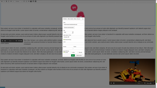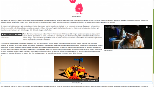 In case the media element is wrapped within a figure element, this widget will add the CSS class image, audio, video or iframe to the figure element. It also supports alignment by setting an appropriate CSS class (left or right), and the attributes width, height and alt. The controls(audio and video) and allowfullscreen (iframe) are automatically set.