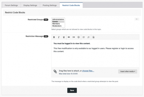 This plugin enables you to restrict viewing code blocks to certain user groups based on forum.Β