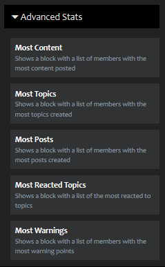 - Each stat page can be shown or hidden to certain members groups in the admin panel except the Member Stats (although it can be hidden to guests) as it's needed for a landing page (If you want to completly disable certain group viewing of it, then you can do that via the module permissions)