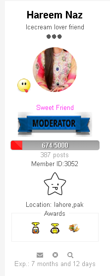 Hareem Naz Posted September 21, 2016 Report Posted September 21, 2016 9 hours ago, Jannat malik said: 1-Dil ki sunti hain ya demaagh ki? 2-Family mein ziada attach kis k saath hn? 3-khaane mein sb se acha kia bnati hn? 4-fav. Subject? 5-ap k mutaabiq love aur frndshp kia hai? Dil ki sunti ho mostly Ma apni Ami jan k sath attach ti kabab bht achay banati Fav subject English Friendship is better than love 1