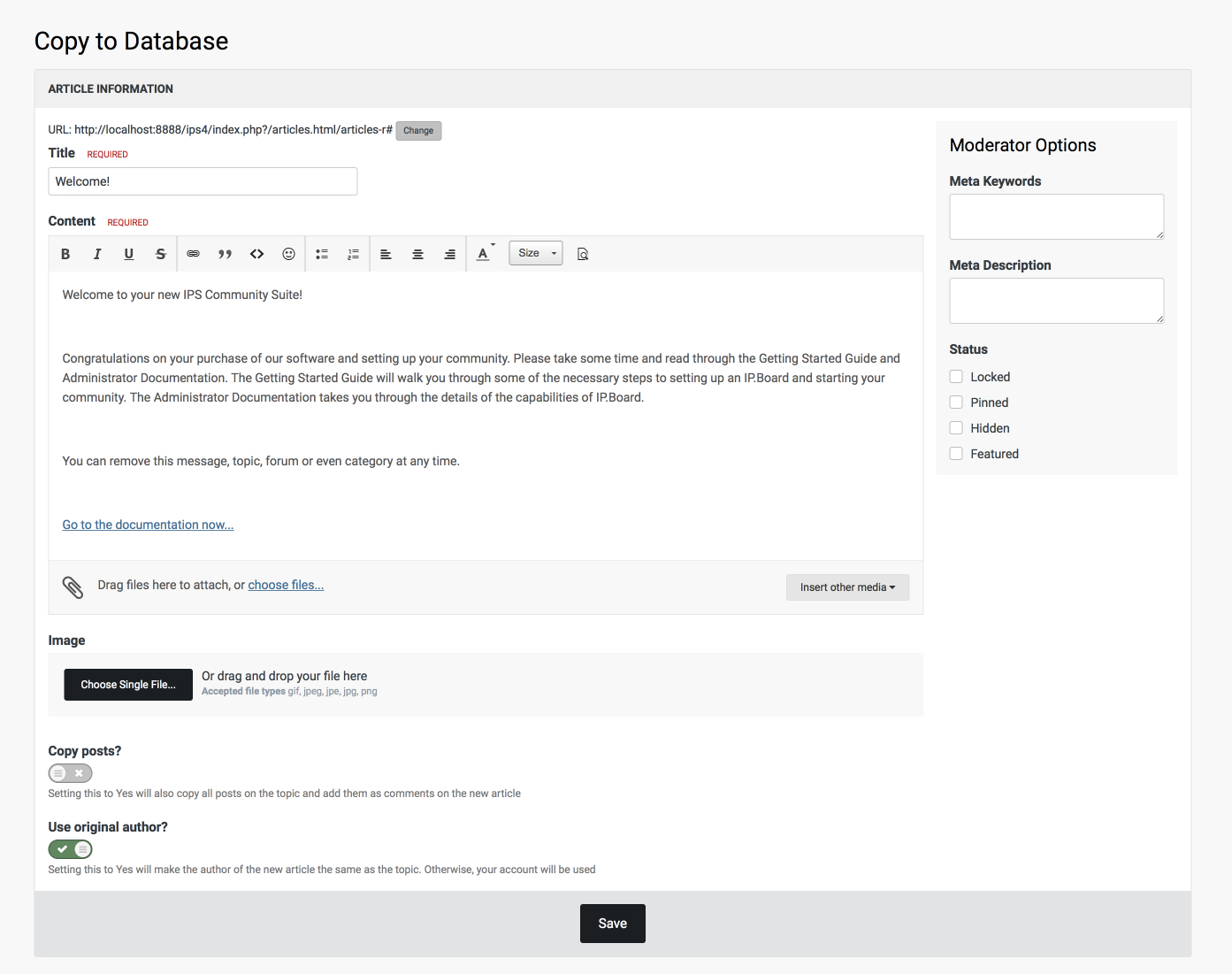 ADMINπ Posted April 5, 2017 Posted April 5, 2017 This is an entry about our IPS Community Suite 4.2 release We have introduced a feature which will allow moderators, with permission, to copy topics from the Forums application, into any custom database in the Pages application. New Moderation Item This feature will copy the contents of the first post of a topic, and copy it as the body of the new record. The moderator copying the topic will then be given a pre-populated form which will have the Title and Content fields automatically filled with the topic title and first post contents, which then can be modified to add any additional notes (such as an editors note at the bottom). The form will also include any custom fields that can be filled in, as well as all moderation options you would normally see when creating a record. Form Input In addition to all of the normal options you would typically see, there are two additional options. The first is the ability to copy all posts in the topic as comments on the new record. The second is the ability to post the record as the original topic author, or as the moderator copying the topic. This new feature is very useful when you might see a topic in the forums that you want to copy to an article or keep in a permanent knowledge base. Β View the full article