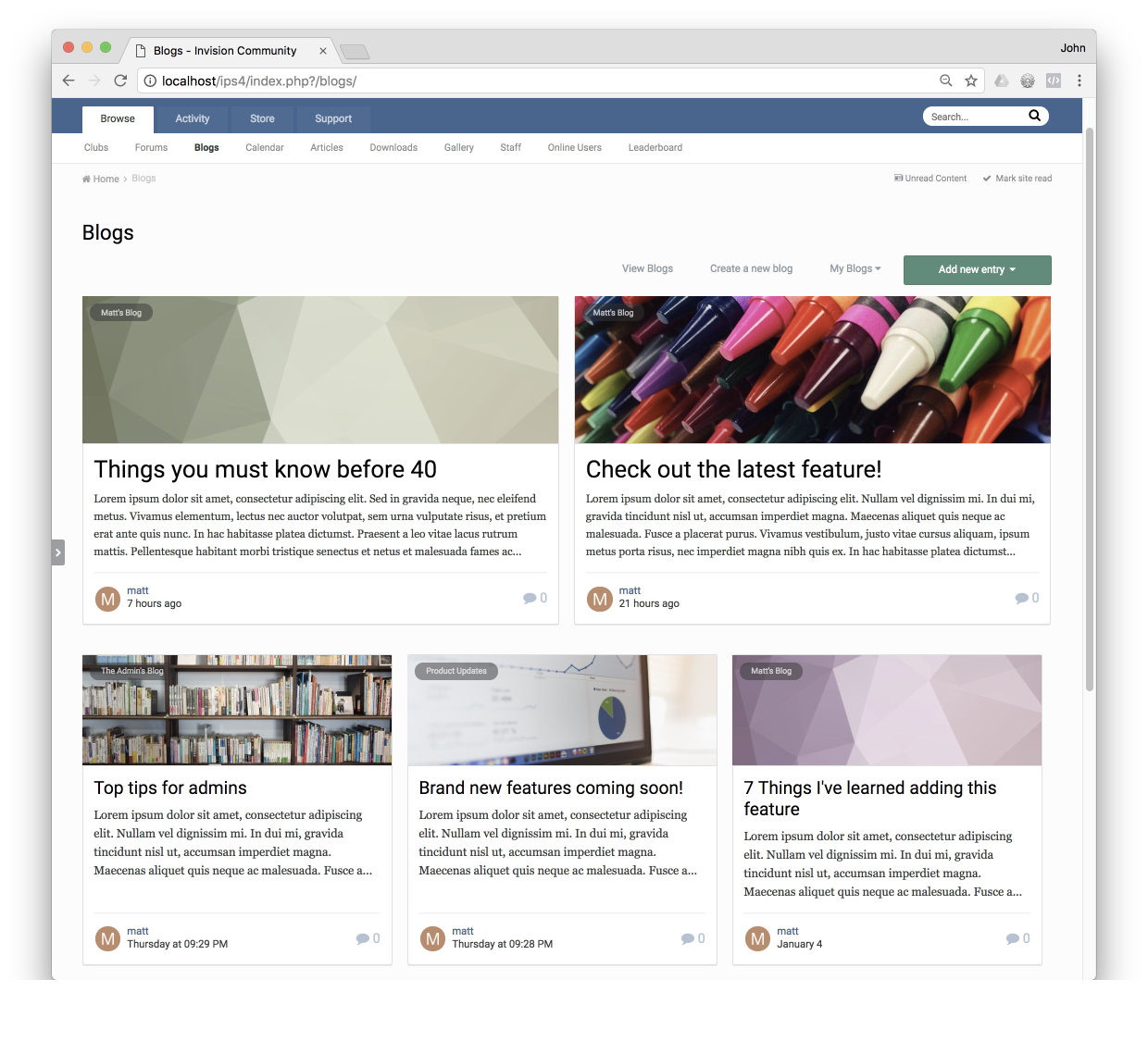 ADMINπ Posted January 16, 2018 Posted January 16, 2018 Good news! We've taken Invision Community's Blog app by the scruff of the neck and dragged it into 2018! There has been a growing trend for imagery to play a very important part of a blog entry. This update reflects that. Introducing Grid View We have added a new view that shows your blog entries as cards with space for a cover photo. We've very visual creatures, and a good photograph can entice readers into your blogs to read more.Β As you would expect, you can disable this mode from the Admin CP for purists that prefer the traditional list format. Β For those who's sense of adventure runs deep, the new grid mode allows you to show a list of latest blog entries as the blog home page. Β This puts valuable and engaging content right in front of your audience. This list view persists when you view a blog's entries giving a consistent feel. Β Viewing an entry We've given the blog entry page a little make-over by featuring the cover photo above the content. The slimmed down blog details bar allows your audience to focus on the content. Β Default Cover Photos You may have spotted that entries without a cover photo have a rather fetching geometric pattern in different colors. Β This is a new micro-feature of Invision Community 4.3. Currently, if you do not have a cover photo on a blog, profile or event, the bar is a rather sad shade of black. The new default cover photo feature makes it much more cheerful. Here's what a profile looks like. Β Much better. Here's a few technical details for those that love to know all the things. The grid view feature can be turned off in the ACP (but doing so will make me very sad) You can choose the default home page view: Latest Entries or List of Blogs. You can still view a list of blogs when you're on the latest entries page. This choice is stored in a little cookie (GDPR friendly, it doesn't contain any identifying data) so navigating back gets you the last view you chose. Let us know what you think! We love it, and hope you do too.